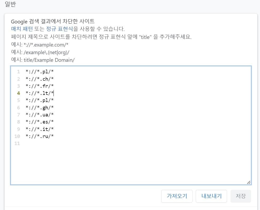 AI로 만든 사이트 주소가 계속해서 추가되고 있기 때문에 이걸로 해도 100퍼센트 걸러지지 않을 순 있지만, 체감상 95%는 사라진다고 .. AI사이트 발견하면 본인이 제외 규칙을 추가해주면 되고 이것을 이용해 구글 검색에 원하는 사이트 안걸리게도 할 수 있습니다.