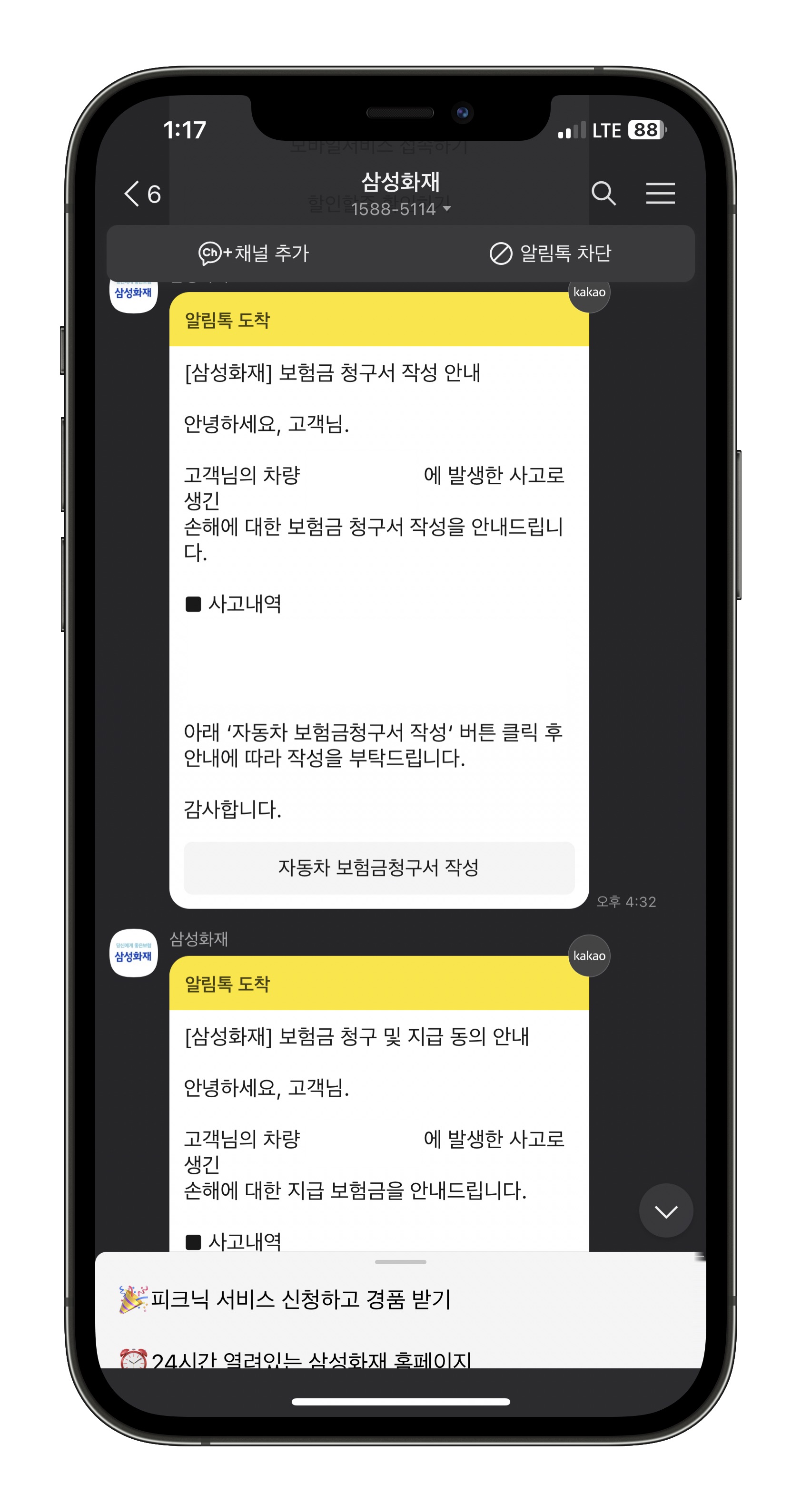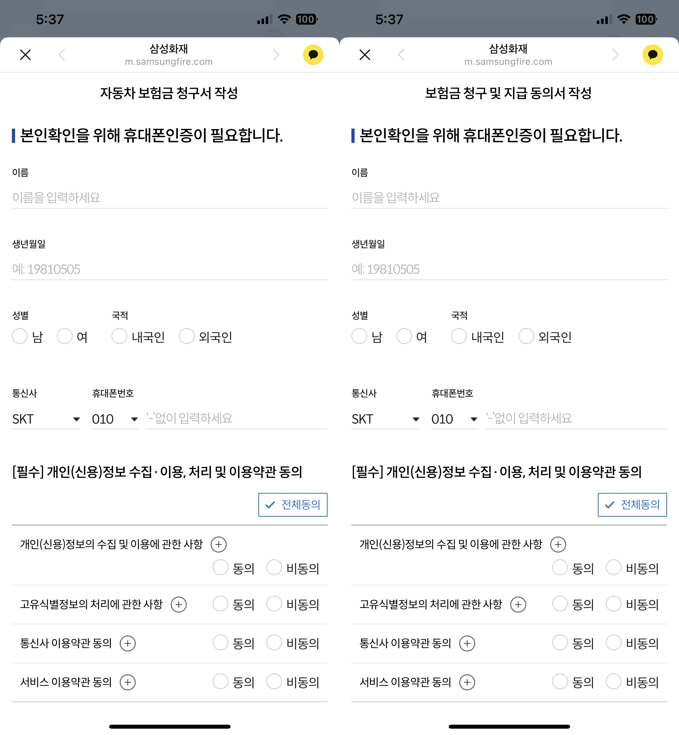 아쉬웠지만 어쩔수가 없이 전손처리 진행을 하기로 다시 보험사에 이야기 했습니다. 보험사에서 카톡으로 자동차 보험금청구서 작성과 보험금 청구 및 지급동의서를 작성해달라고 해서 두개를 간단하게 작성했습니다.