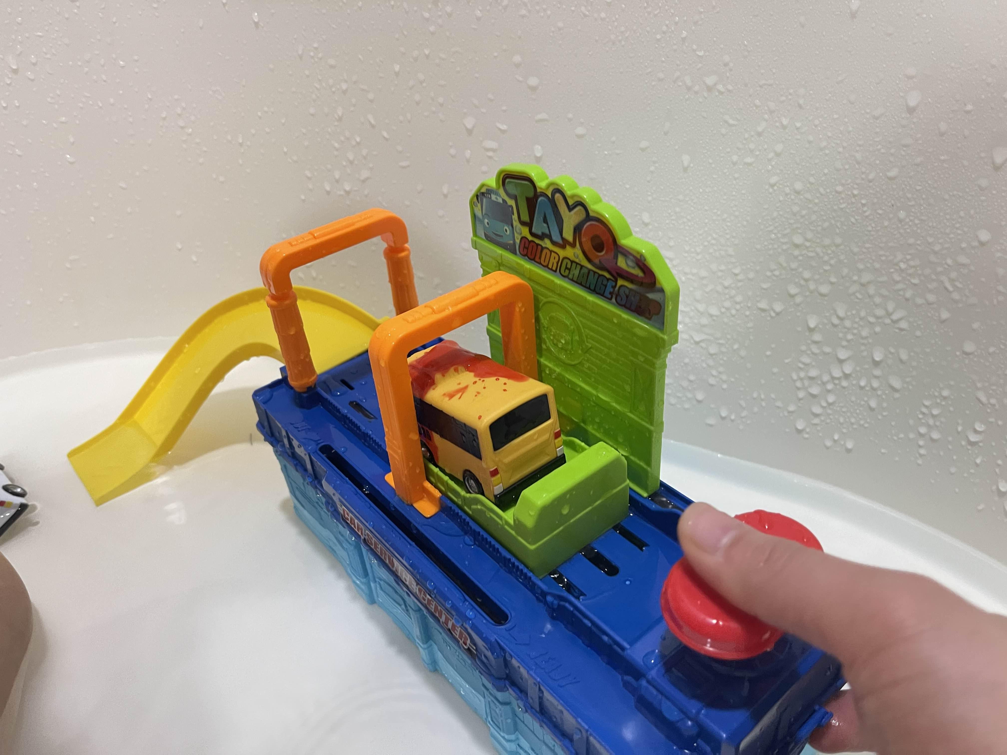 따뜻한물에서 흰색 버스가 된 장난감을 물을 뿌려 타요로 만들고 있어요.