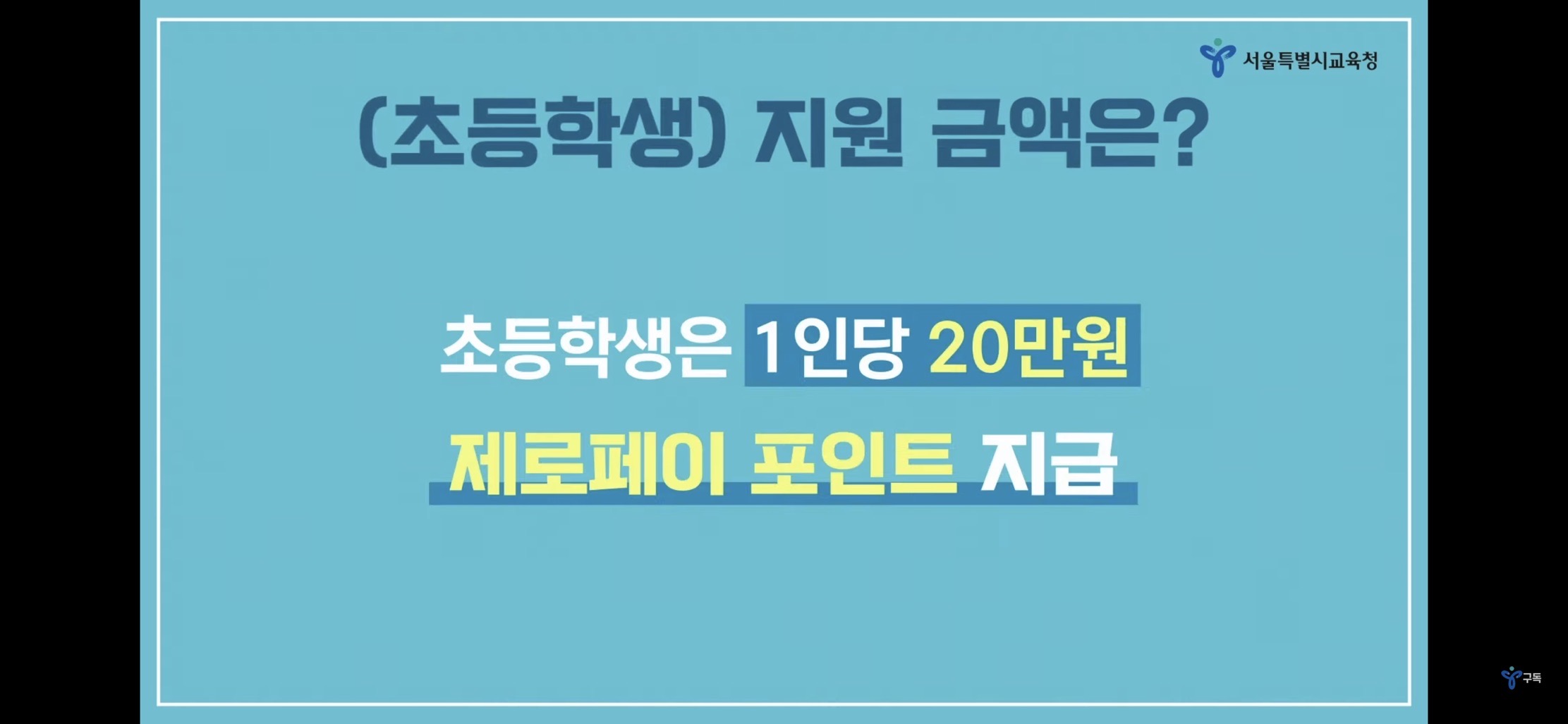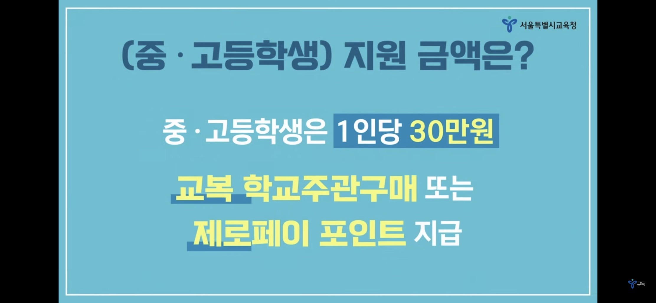 지급은 제로페이(모바일포인트)로 지급이 되며, 금액은 중학생 고등학생은 1인당 30만원, 초등학생의 경우 20만원이 지원됩니다.
