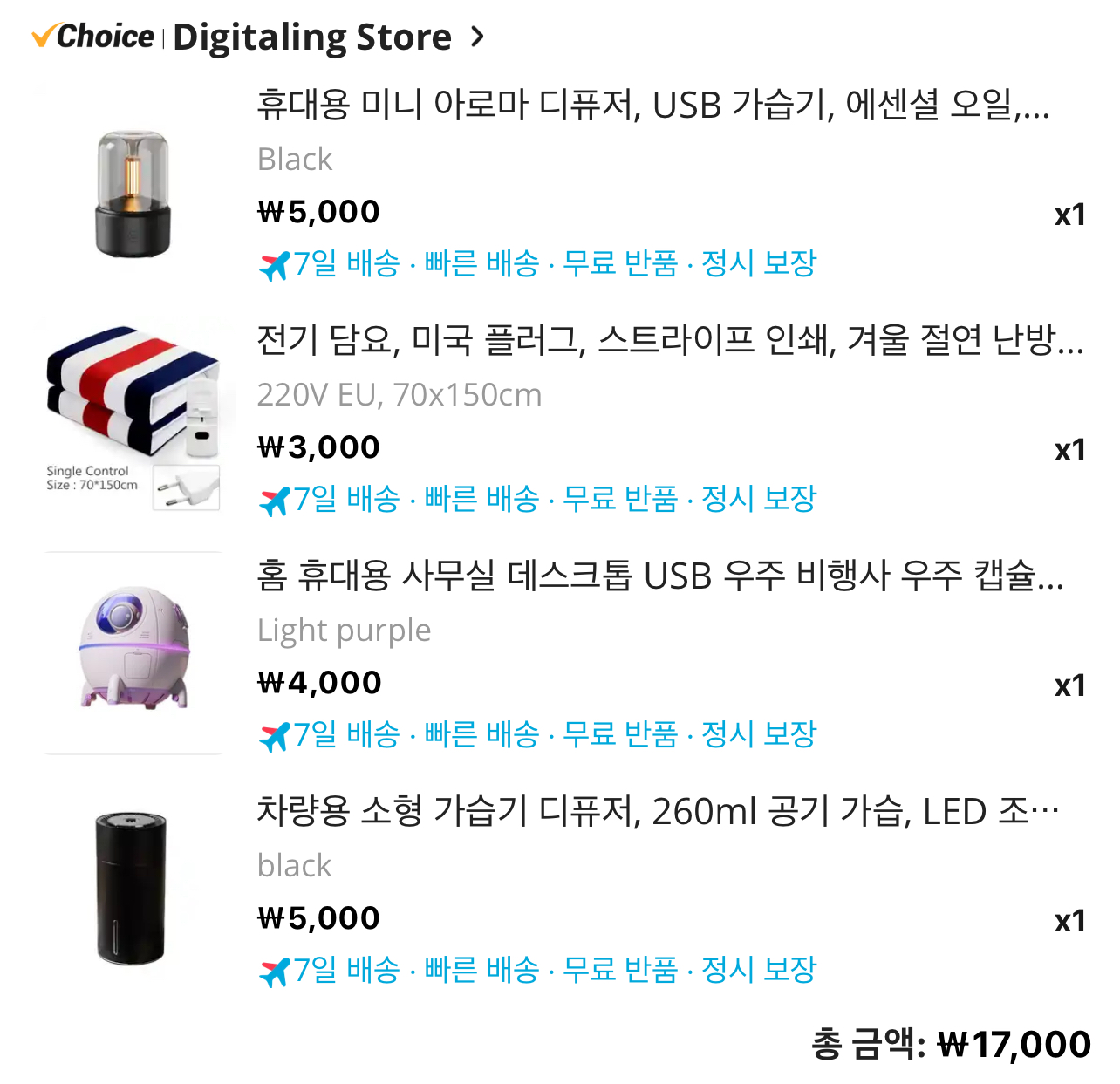 알리 에서 구매한 가격은 4천원 입니다. 아이방에 잠깐 잠깐 틀어줄 용도로 하나 구매해봤습니다. 이외에는 차량에 둘 미니 가습기 그리고 캠핑장에서 팬히터랑 같이 사용할 아로마 가습기도 같이 구매 해봤습니다.