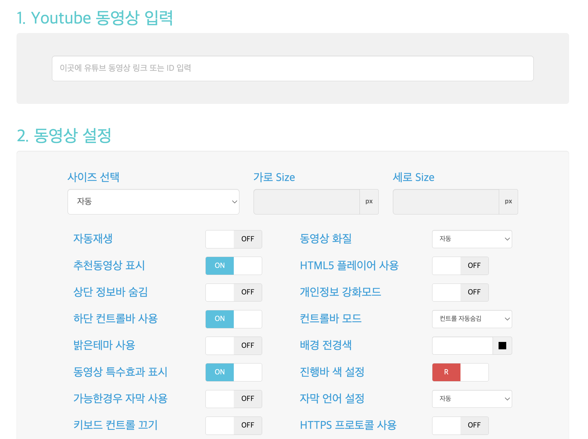 유튜브 동영상을 넣을 때마다 코드를 수정하는 것이 번거롭다면 jQuery를 이용하여 자동으로 적용되도록 할 수 있습니다.
